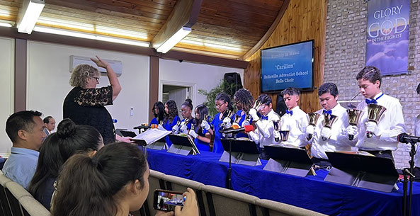 eltsville Adventist School (BAS) has an evangelism program called the “BAS Hand Band,” which was revived in 2022 and is now directed by music teacher Robin Roys, with support from Principal Jerson Malaguit. NAD got us new puppets and it has been such a blessing to us and others. It is an outreach ministry team of 8th-graders who illustrate Bible stories and songs with hand puppets and English handbells, to local churches. The group is often featured as a special musical guest with the handbells, and the puppets serve as featured performers in the children’s story.